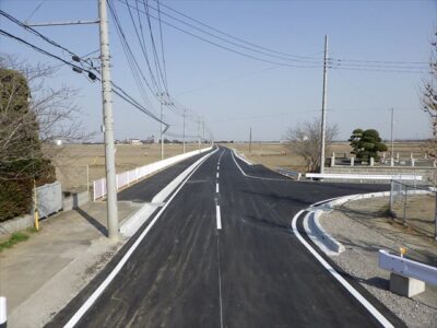 古くなった道路の表層から路盤まで剥がし、路床から整える改良工事を行いました。側溝や歩道の整備も併せて施工致しました。